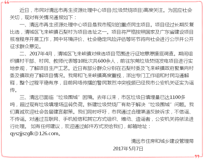 關(guān)于清城區(qū)飛來峽鎮(zhèn)石梨村清遠(yuǎn)市再生資源處理中心項目的情況通報